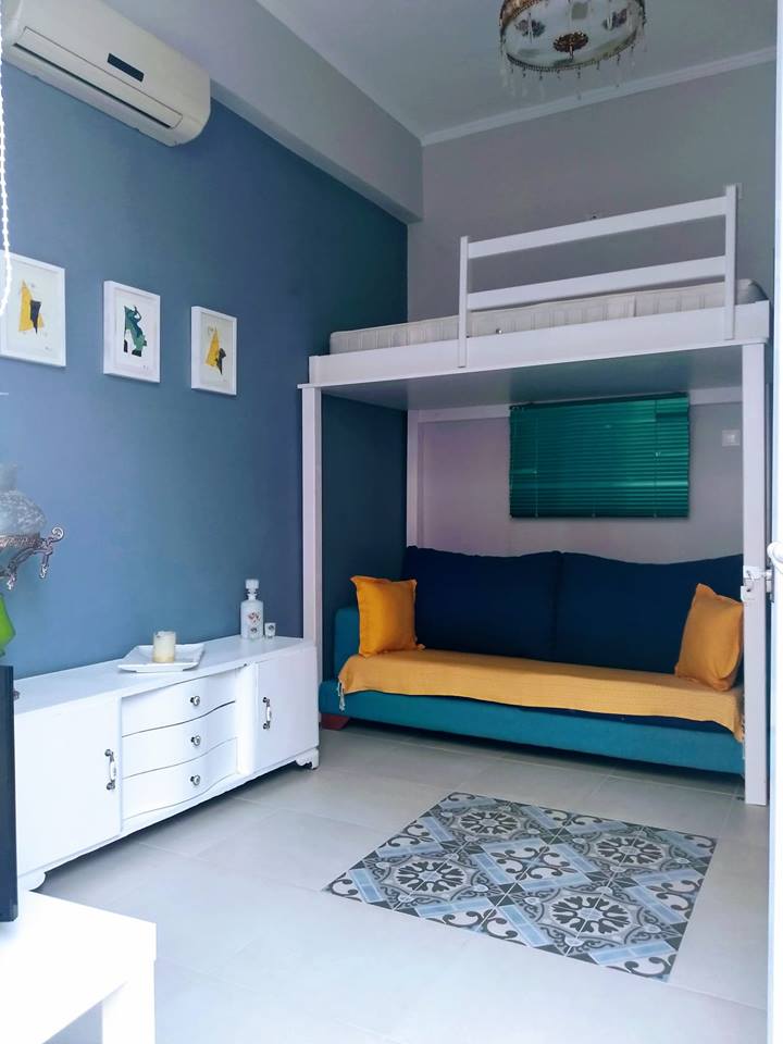 Our Maisonette suite Lotros is an ideal two level apartment, that can facilitate up to 4 guests. On the lower level you will find the sitting area with sofa bed, kitchen and bathroom . The steps lead you to the upper level, where you will find one Queen-size bed and wall closets. The Maisonnete suite provides sea views from both levels.