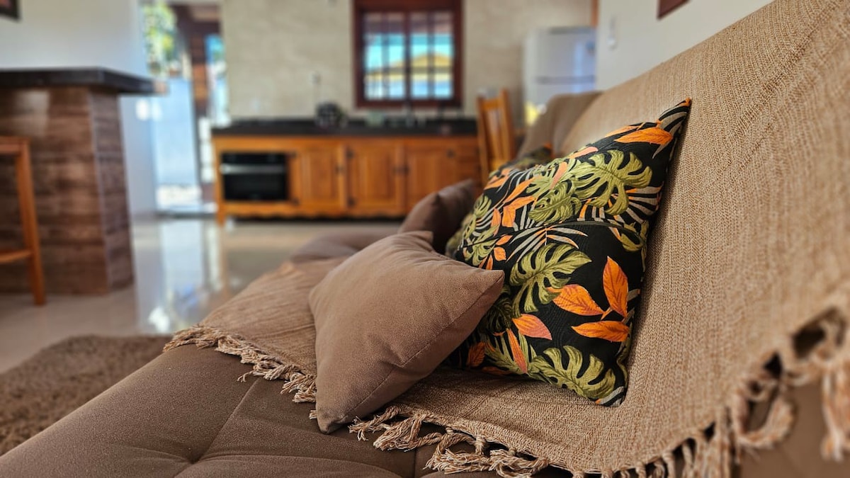 Super charming house and very central, in the middle of nature :) Rustic and comfortable, draws attention for its ceramic details and distinct materials, with a touch of natural and contemporary creativity. A colorful environment to rejuvenate your spirit and soul, with the advantage of being right in the center and doing everything on foot. • Double bedroom and double sofa bed in living room • Full kitchen and WiFi; • Nature and tranquility; • 100m main street; kisses, Dana