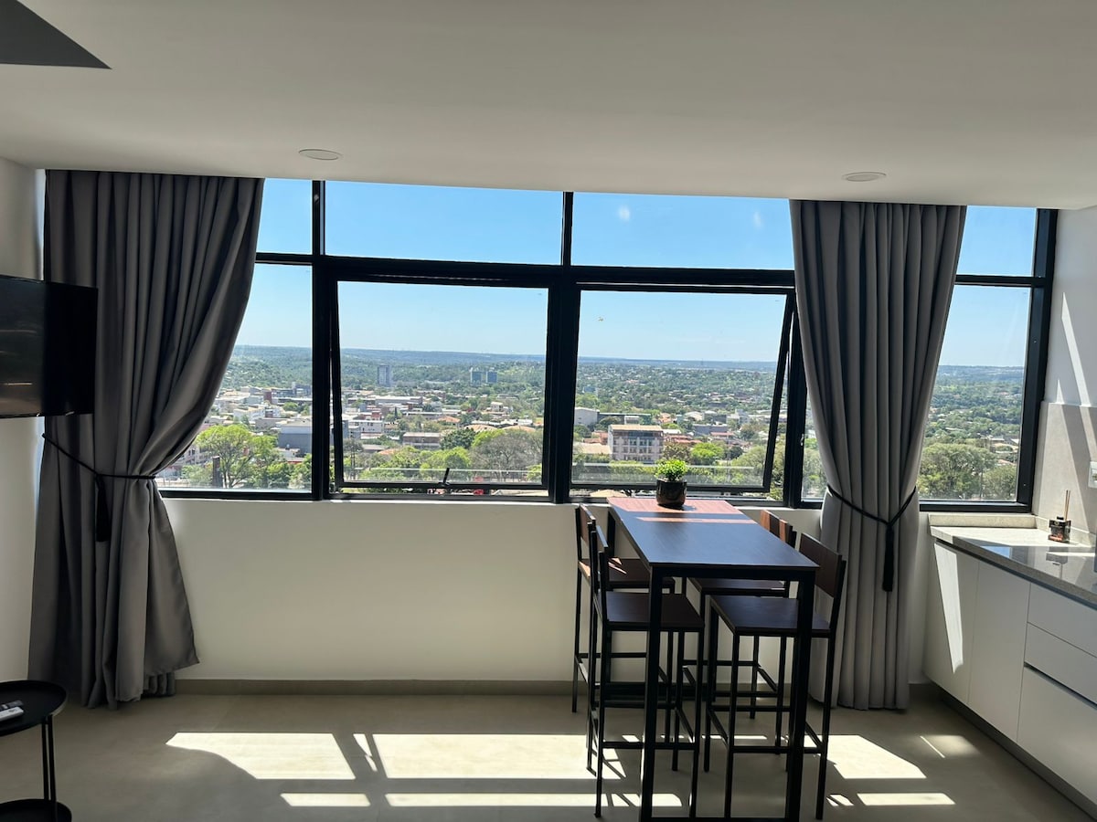 Njóttu einstakrar gistingar í þessari glæsilegu íbúð í Ciudad del Este. Hér er herbergi með hjónarúmi og stórum svefnsófa sem hentar fyrir allt að 4 manns. Það býður upp á þægindi og stíl með grilli og stórum svölum með nútímalegri hönnun og sérhönnuðum húsgögnum. Byggingin er ný og innifelur þægindi eins og: endalausa sundlaug í hæð, samstarf, líkamsrækt, barnasetustofu, þvottahús, anddyri, setustofur og öryggisgæslu allan sólarhringinn. Staðsett á stefnumarkandi svæði sem hentar vel fyrir vinnu eða afslöppun.