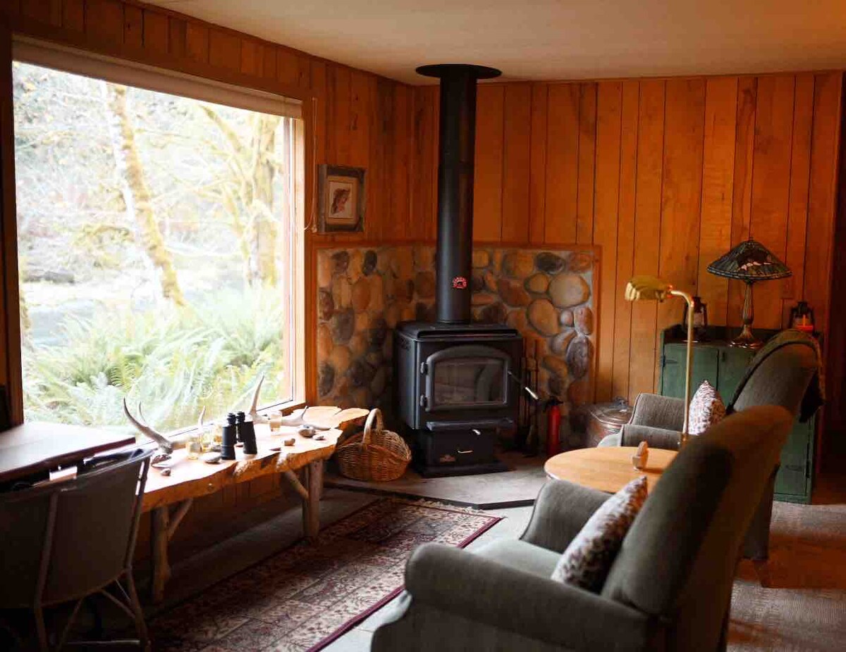 Njóttu kyrrðar í þessum kofa við ána. Slakaðu á við gasarinn eða eldaðu í glæsilegu eldhúsinu með útsýni yfir ána og mosavaxin tré af veröndinni. Kynnstu náttúrunni á Discovery Trail í nágrenninu (0.08 mílur). Heimsæktu Sol Duc Hot Springs, Olympic National Park, Lake Crescent og La Push. Forks og Kalaloch eru í nágrenninu. Njóttu afþreyingar í tveimur sjónvörpum (1 Blu-ray, 1 Wi-Fi), 50 dvds í boði en hafðu í huga að það er engin uppþvottavél og þráðlaust net og farsímaþjónusta geta verið MEÐ HLÉUM.