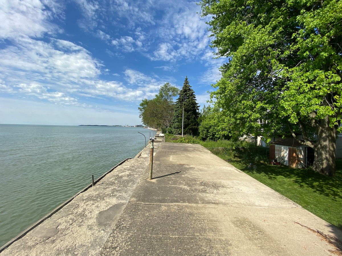 Full water view (Front and Back yard), boat dock and beach access This is a spacious 2000 square feet HOUSE, 2 stories cottage with an open concept living space equipped with central heating and air conditioning. This 82’ waterfront property provides an infinite view of Lake Erie, Ohio & Michigan. Jump off the dock into the lake, direct access to the lake from our private boat ramp. The conservation Marsh on the other side.