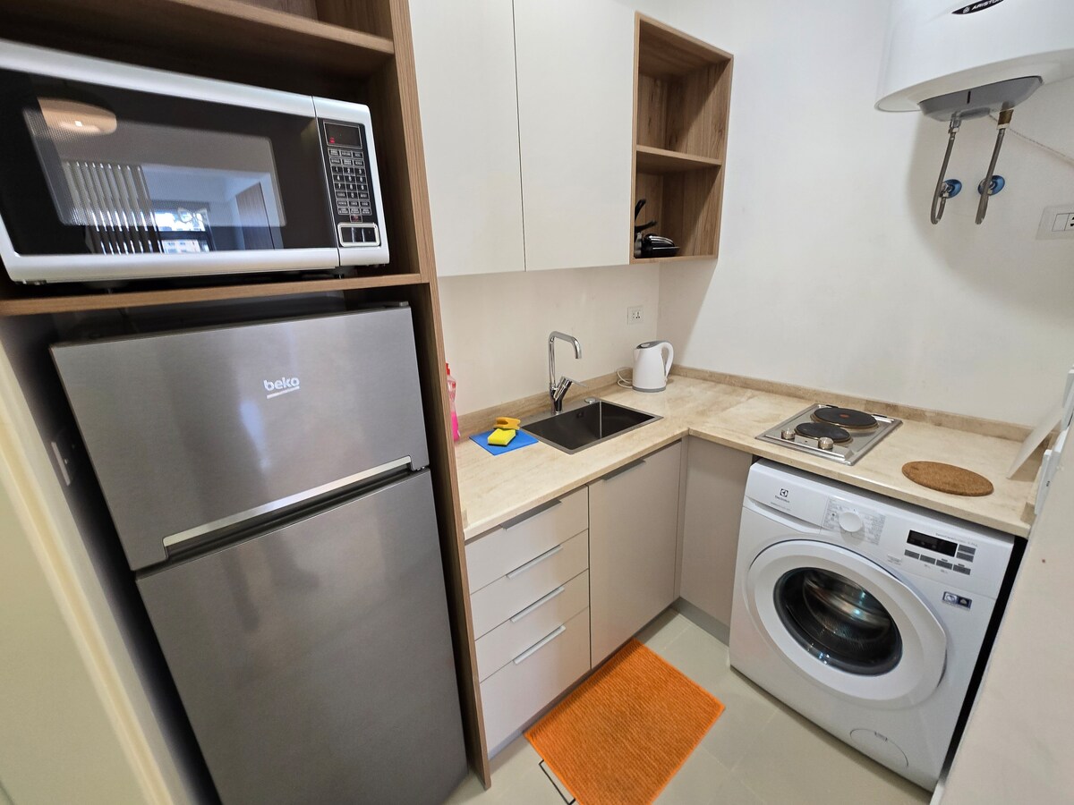 Þú munt upplifa lúxus og endalaust útsýni frá hverju horni þessarar hönnunaríbúðar. Það býður upp á stóra verönd með endalausu útsýni og hljóðeinangraðir gluggar frá lofti til gólfs. Sérhver sólarupprás og sólsetur verður einkasýning fyrir þig. Njóttu úrvalsrúms í king-stærð, þægilegs svefnsófa, snjallsjónvarps með hröðu neti og fullbúnu eldhúsi. Glæný bygging, vandaðar innréttingar, lyfta, einkabílastæði og vinsælustu þægindin. Allir vinsælustu staðirnir, verslanir og bestu veitingastaðirnir eru í nokkurra mínútna göngufjarlægð!
