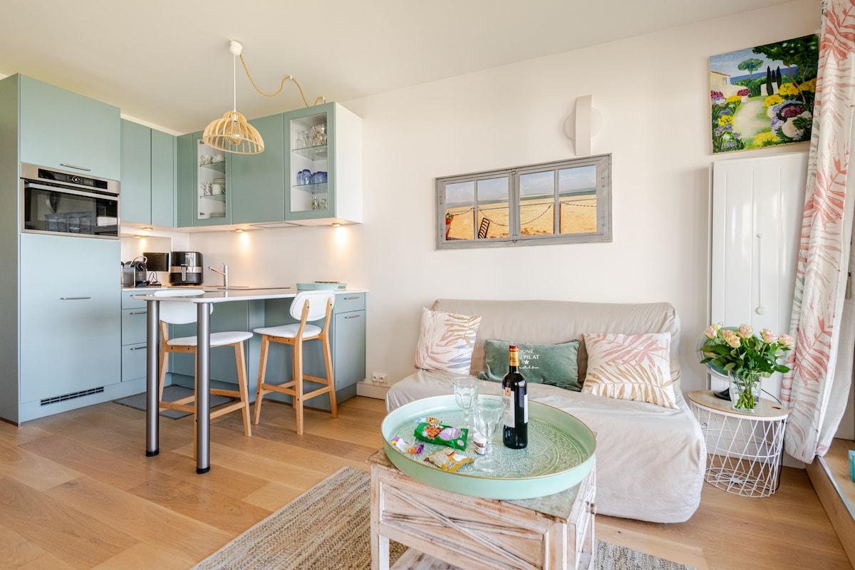 Eftir friðsælan morgunverð á veröndinni þar sem þú horfir á bátana fara framhjá getur þú farið í sund á ströndinni með beinum aðgangi. Stofan með eldhúsbar með útsýni yfir sjóinn. Vinnustofusvefnherbergið stuðlar að sjarma íbúðarinnar. Í litlum kofa er pláss fyrir eitt eða tvö börn. Allt er fótgangandi eða á hjóli vegna hjólreiðastígsins við rætur byggingarinnar. Thalassotherapy er steinsnar í burtu. Á kvöldin í fordrykk mun magnað sólsetrið koma þér á óvart