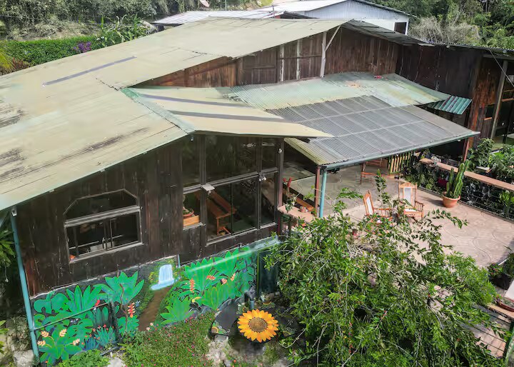 Made of a recyclable container ♻️ artistically designed with wood 🪵exótica ,porcelain tile walls, next to it you have a private path to walk, a waterfall next to it / you are in harmony with nature/the sink is made of natural stone 🪨/ the bathroom is panoramic, there is an area with a view of the volcano 🌋 and the City we are inside a Private residential. We have a mountainous path and a Hamaca bridge 5 minutes away There are menus from local restaurants, also equipped to cook 🍜🍲