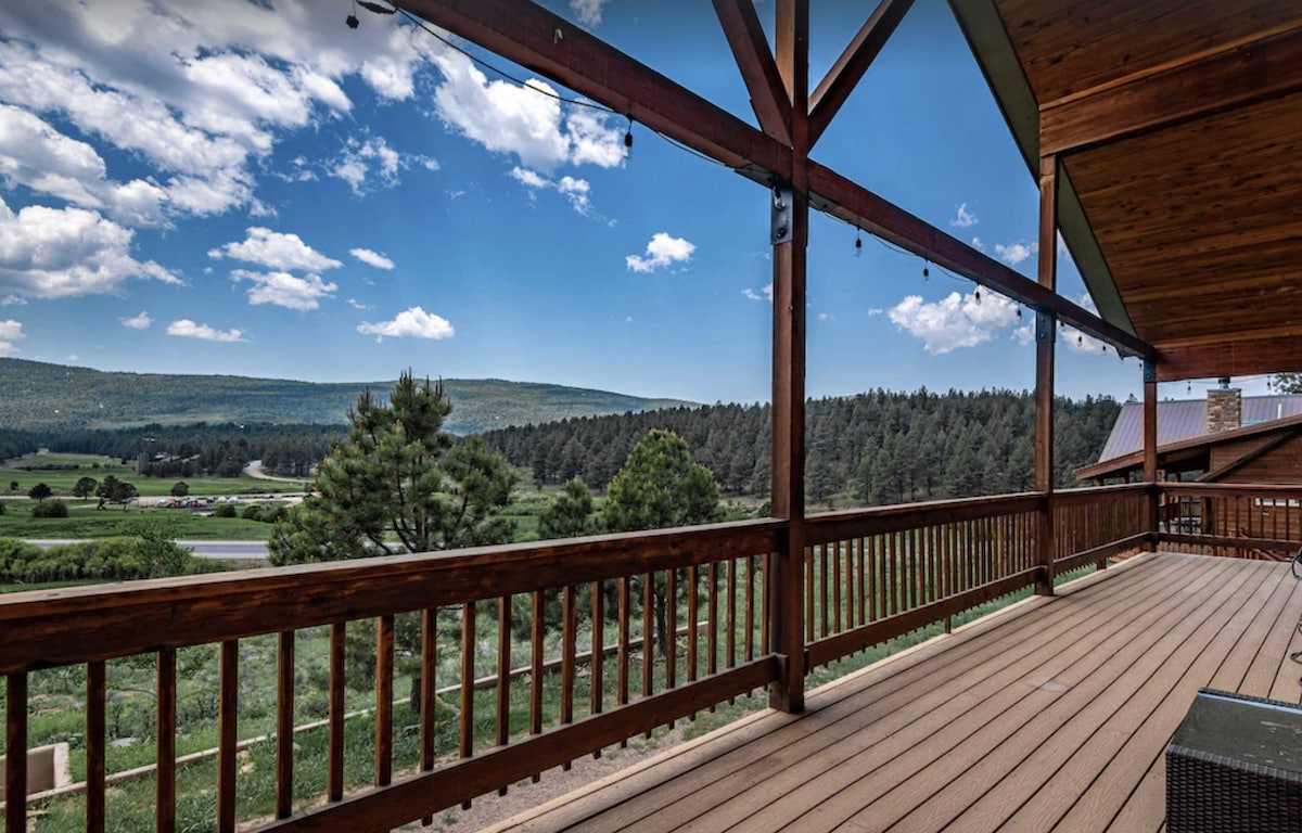 Slakaðu á með fjölskyldunni á þessu friðsæla, gæludýravæna fjallaheimili með yfirgripsmiklu útsýni og sjónauka. Njóttu nýja heita pottsins eða grillaðu máltíð á veröndinni sem er umkringd hektara af trjám. Hraðvirkt netsamband vegna vinnu eða til að streyma uppáhalds kvikmyndunum þínum. Nýi Fröken Pac-Man leikurinn okkar kemur með DigDug, Super Pac-Man og fleiri stöðum. Njóttu aðgangs að Angel Fire-stígakerfinu fyrir endalausar gönguferðir og hjólreiðar. Cabin is short walk to Monte Verde Lake for boating and fishing and a short drive to the golf course and