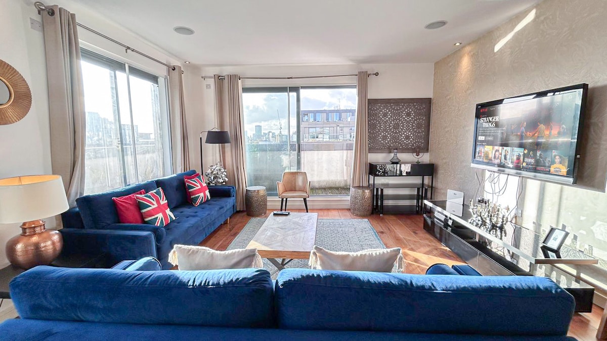 Slappaðu af með bók í kyrrlátri vin. Sökktu þér í ríka sögu Spitalfields frá þessu friðsæla 37 fermetra afdrepi með 1 svefnherbergi. Slakaðu á í brasilísku hengirúmi undir fiðurblaða fíkjutré í fullri hæð sem er fullkominn staður til að slaka á meðan borgin iðar af. Njóttu myndvarpa fyrir leysibíó með 100 tommu skjá og innlifunarhljóði til að streyma uppáhaldsþáttunum þínum og kvikmyndum. Þessi íbúð er knúin af 100% endurnýjanlegri orku og blandar saman þægindum, afþreyingu og sjálfbærni í hjarta borgarinnar.