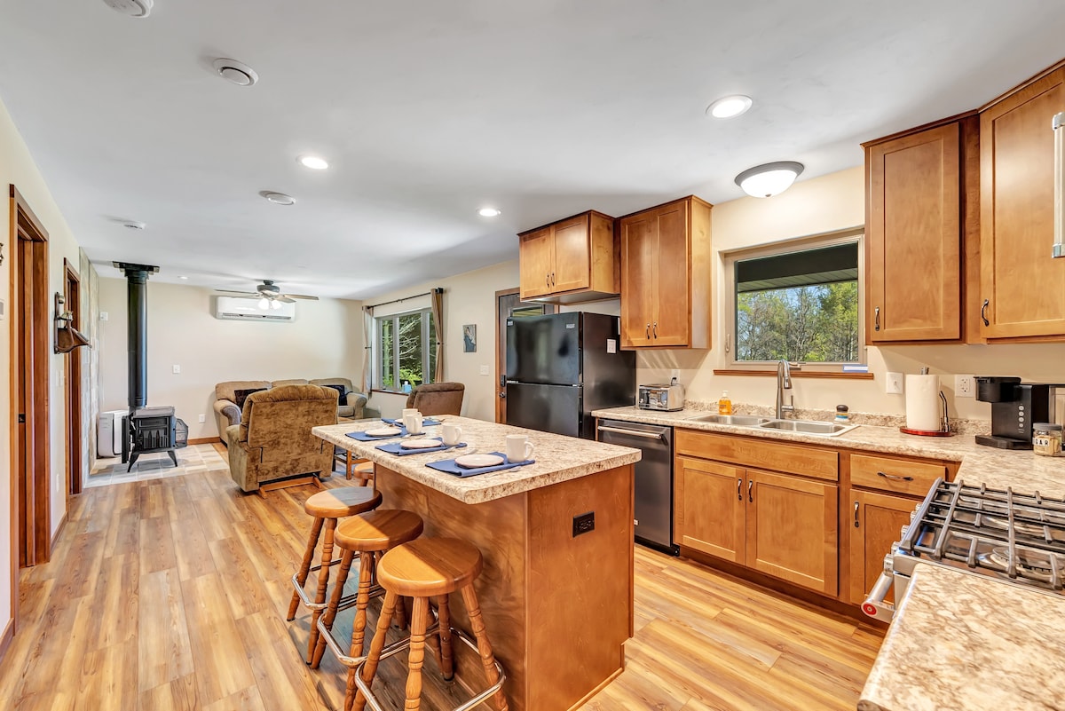 Velkomin í Hnetuhúsið! Frá sveitalegum harðviðargólfum að logstigum, bjálkum, hnoðuðum furuloftum og antíksklófótarbaði finnur þú tilfinningu fyrir Northwoods sjarma um leið og þú stígur inn um útidyrnar á fallega tveggja svefnherbergja kofanum okkar. Dýralífið er staðsett á hljóðlátum (fjórhjólaferð) bæjarvegi og er á rúmlega 6 hektara skógi vaxinni lóð. Opin hugmyndastofa með nægum sætum, borðstofu og sætum eldhúseyja veita nóg pláss. Bara 40 mínútur til Lambeau!