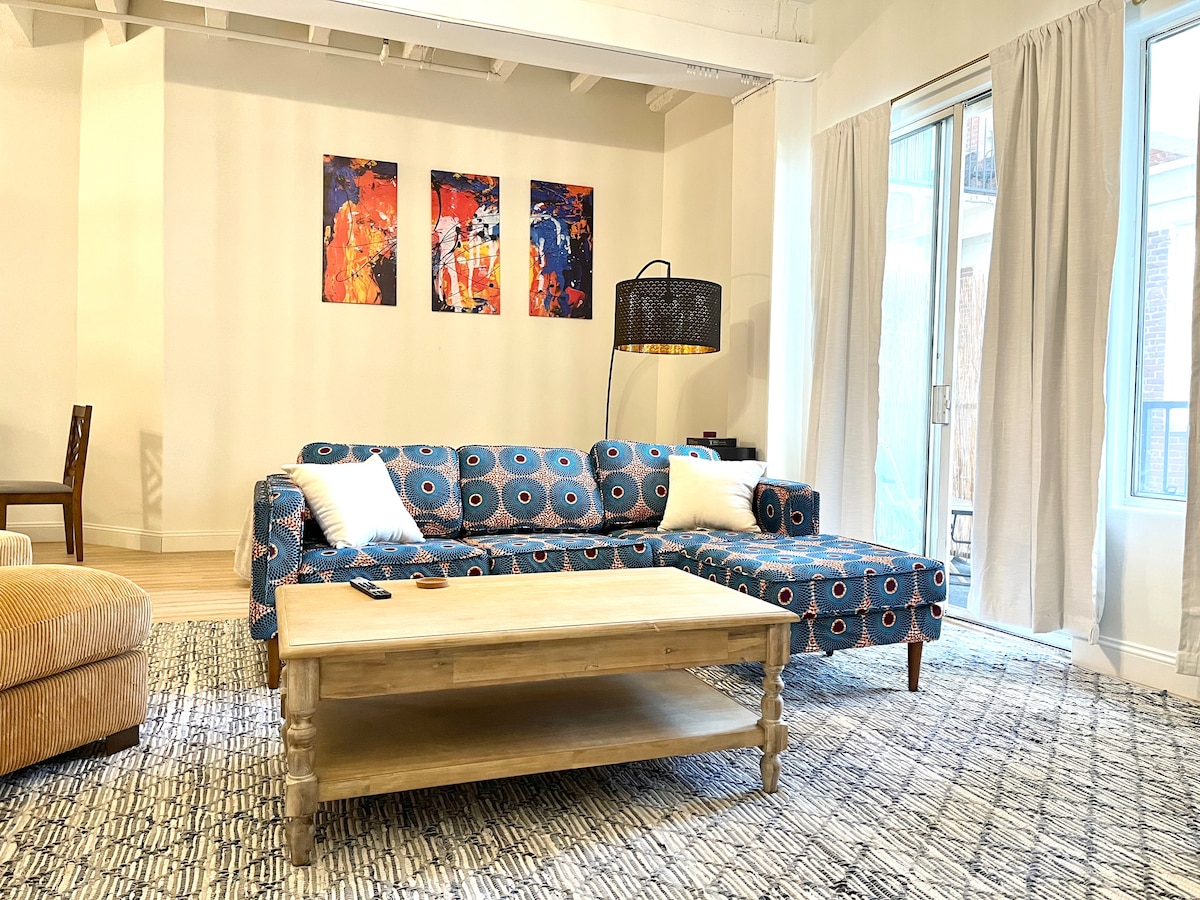 Lestu húsreglur og hverfislýsingar ÁÐUR EN ÞÚ bókar. Með því að bóka samþykkir þú allar húsreglur! Komdu og njóttu fallegs útsýnis og slakaðu á í þessari 10. hæð frá 1920 í Beaux-Arts-loftinu sem er staðsett í sögulega kjarnanum. Iðnaðar fortíð þessa uppgerða rýmis er enn til staðar í hásteyptri lofthæð og gólfum. Samkvæmt öryggisreglum byggingarinnar verða gestir að framvísa opinberum skilríkjum til gestgjafa og/eða vakt þegar bókað hefur verið.