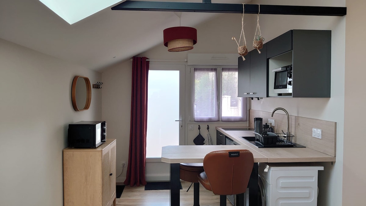 Þægileg gisting fyrir dvöl (afþreyingu, faglega...), róleg, algjörlega óháð aðalhlutanum. Hún er 28 fermetrar að stærð og inniheldur: - stofa með svefnaðstöðu, skrifborði, sófa og sjónvarpi - vel búið eldhús (kaffivél, ketill, brauðrist o.s.frv.) - sturtuklefa - útisvæði fyrir borðhald Staðsett nálægt miðborginni (20 mínútna göngufjarlægð) eða strætisvagnastöð í 5 mínútna fjarlægð, sporvagn í 9 mínútna fjarlægð, það verður fullkomið til að skoða fallega borgina okkar!