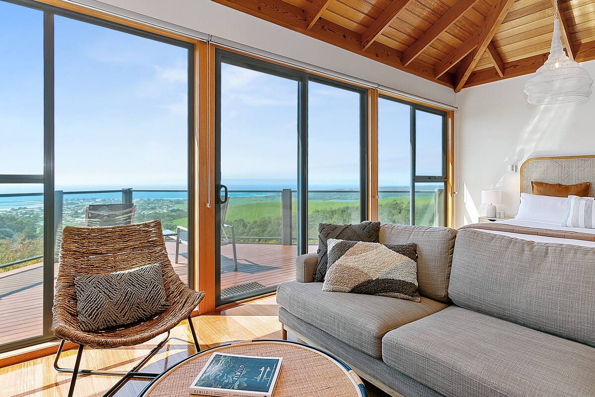 Hin fullkomna undankomuleið í fallegu Anglesea. Komdu og njóttu þessarar einstöku opnu stofu með töfrandi útsýni yfir hafið og sólarupprás. Á hverjum morgni tekur sólin á móti okkur sem lýsir upp sjóinn og dalinn. Þér mun líða vel að taka á móti þér á hverjum nýjum degi sem skín inn í húsið. Dýfðu þér í náttúruna þegar fuglar á staðnum, kengúrur og fílar koma í heimsókn frá trjátoppum og daljum í kring. Stutt að fara á brimbretti, á táknrænar strendur, í skemmtanir, á veitingastaði og í verslanir á staðnum.