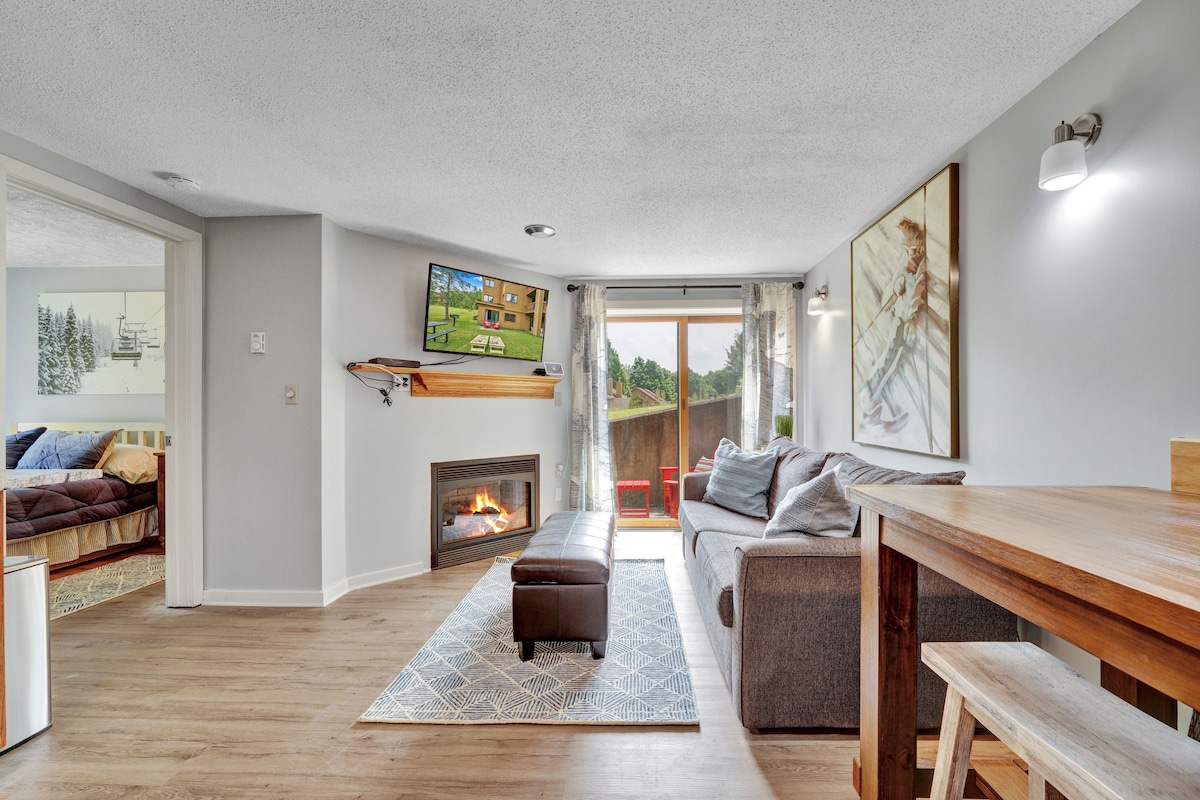 Íbúð með skíðaaðgengi, king-rúmi og arineldsstæði