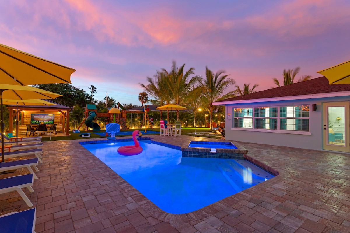 Heillandi 100 ára enduruppgert steinhús með ítölsku ívafi – nálægt strönd og miðbæ! Verið velkomin í draumaferðina þína! Þetta fallega, endurbyggða 100 ára gamla steinhús blandar saman sjarma gamla heimsins og nútímalegum lúxus. Þetta einstaka afdrep er innblásið af glæsileika Ítalíu og er í nokkurra mínútna fjarlægð frá ströndinni og líflegum miðbæ Bradenton. Á heimilinu er mikil dagsbirta og þar eru 2 svefnherbergi, 2 hálf baðherbergi og rúmgóður garður! Þú munt elska upphituðu laugina og eldstæðið utandyra til að slaka á allt árið um kring.