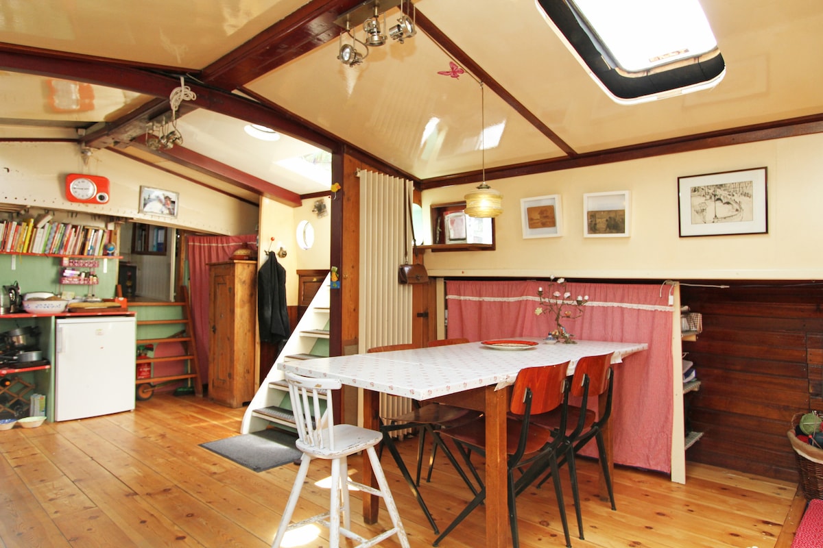 Gorgeous houseboat moored on historic canal. The B&B is 60 m2, with ample living space, an open kitchen, a bedroom and bathroom. Outside is a large deck. Perfect for a couple, not for guests who have trouble with steep stairs The boat is called “Musard” and was built in 1922 in Rouen, France. We live in the rear end of the boat and our guests stay in the front. Older reviews are of the same location, but we used to rent out the total boat! Now the space fits 2 guests, not more.