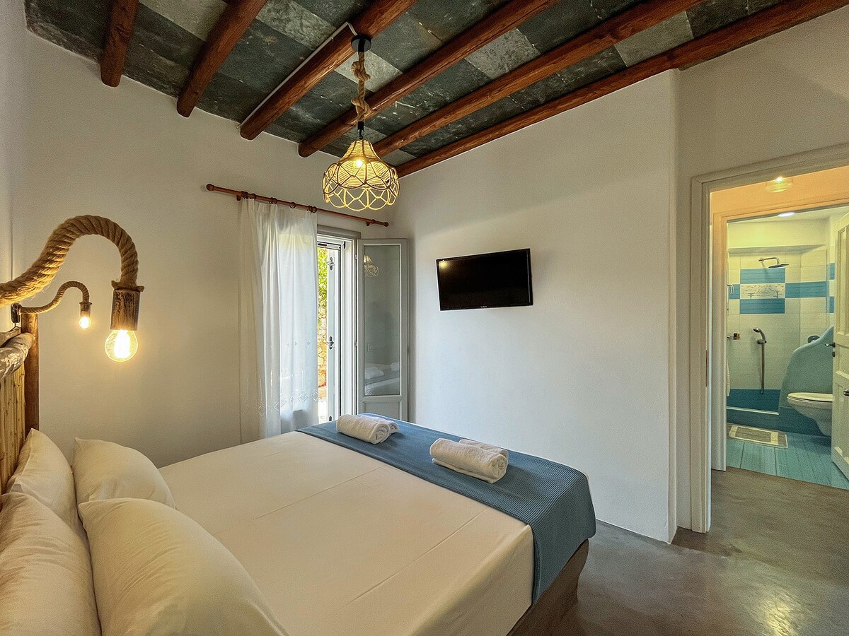 Nýjar íbúðir með fullbúnu eldhúsi, útsýni yfir Eyjahafið og sólarupprásina! Staðsetning hússins nýtur mikilla forréttinda þar sem það er byggt í miðjunni og á hæsta punkti eyjunnar. Svo þú hefur gaman af endalausu útsýni og þú ert í mjög stuttri fjarlægð frá þorpunum og helstu ströndum! Þú kynnist gestrisni Grikkja og meðan við búum í næsta húsi munum við vera þér innan handar hvenær sem er.