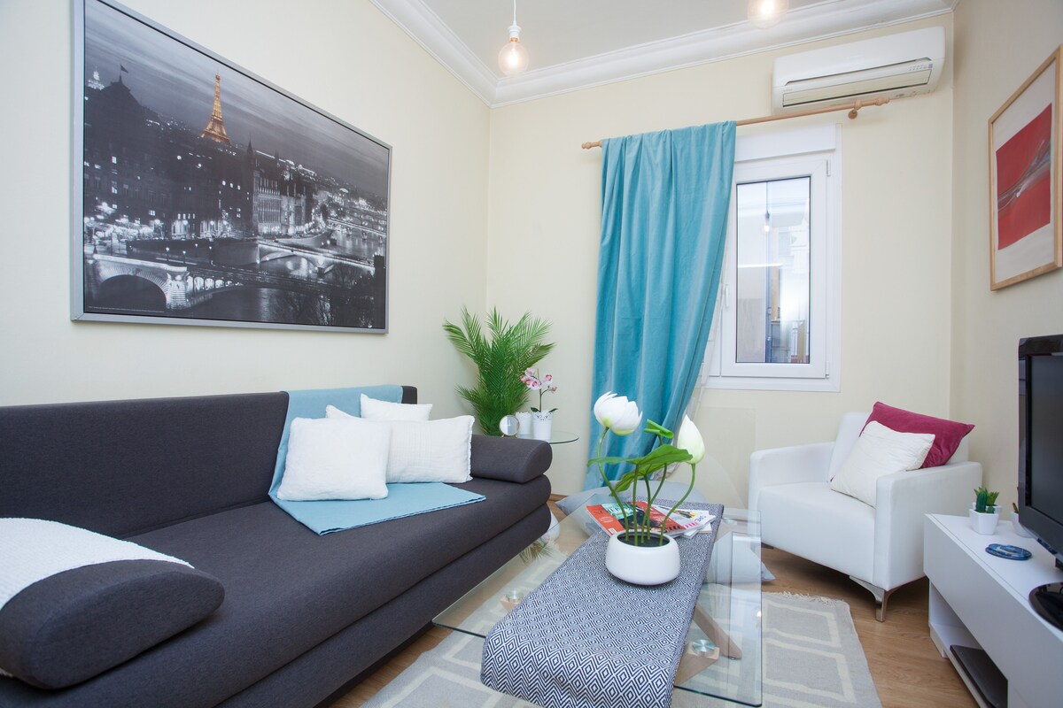 Enjoy a stylish stay at this centrally-located condo. - At the City Center. 5 min walk from Aristotle Square - 1 minute walk from Venizelou metro station with many bus stops also nearby - Several tavernas/restaurants & cafeterias at few minutes walking distance - Fully equipped & family friendly - Supermarket (Discount Markt & Market-in) available at 4 minutes walking distance and a larger one (Masoutis) at 5 minutes walking distance. A 24/7 always open convenience store just outside.