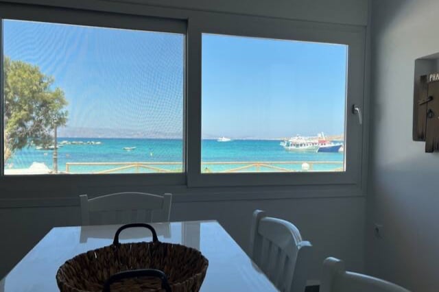 Opnaðu sjávarbláu hlerana og hleyptu inn kæligolunni og fáðu þér svo snarl við steypta eldhúsborðplötuna í blæbrigðaríku afdrepi við vatnið. Stígðu út á rúmgóða, laufskrýdda veröndina til að fá rólega sólsetursdrykki með óhindruðu sjávarútsýni! Íbúðin er staðsett við hliðina á sandströnd til að synda á morgnana og í 2 mínútna göngufjarlægð frá miðbæ Naousa og aðaltorginu. Verslanir, veitingastaðir, barir og klúbbar eru í göngufæri en svæðið er samt mjög rólegt og rólegt!