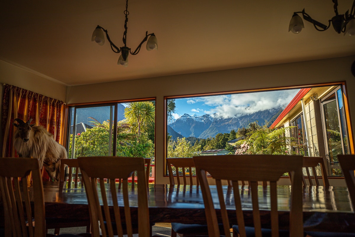 Relax in this small but cosy, quiet space surrounded by native rainforest and mountain views. Enjoy vistas of Aoraki Mt Cook and the New Zealand Southern Alps from your private patio. Located a 5-minute drive from Fox Glacier and Lake Matheson, this private guesthouse offers a queen bed and ensuite bathroom with a high-pressure shower. and tea/coffee facilities. Roam our gardens and play with our friendly dogs. Your serene retreat awaits!