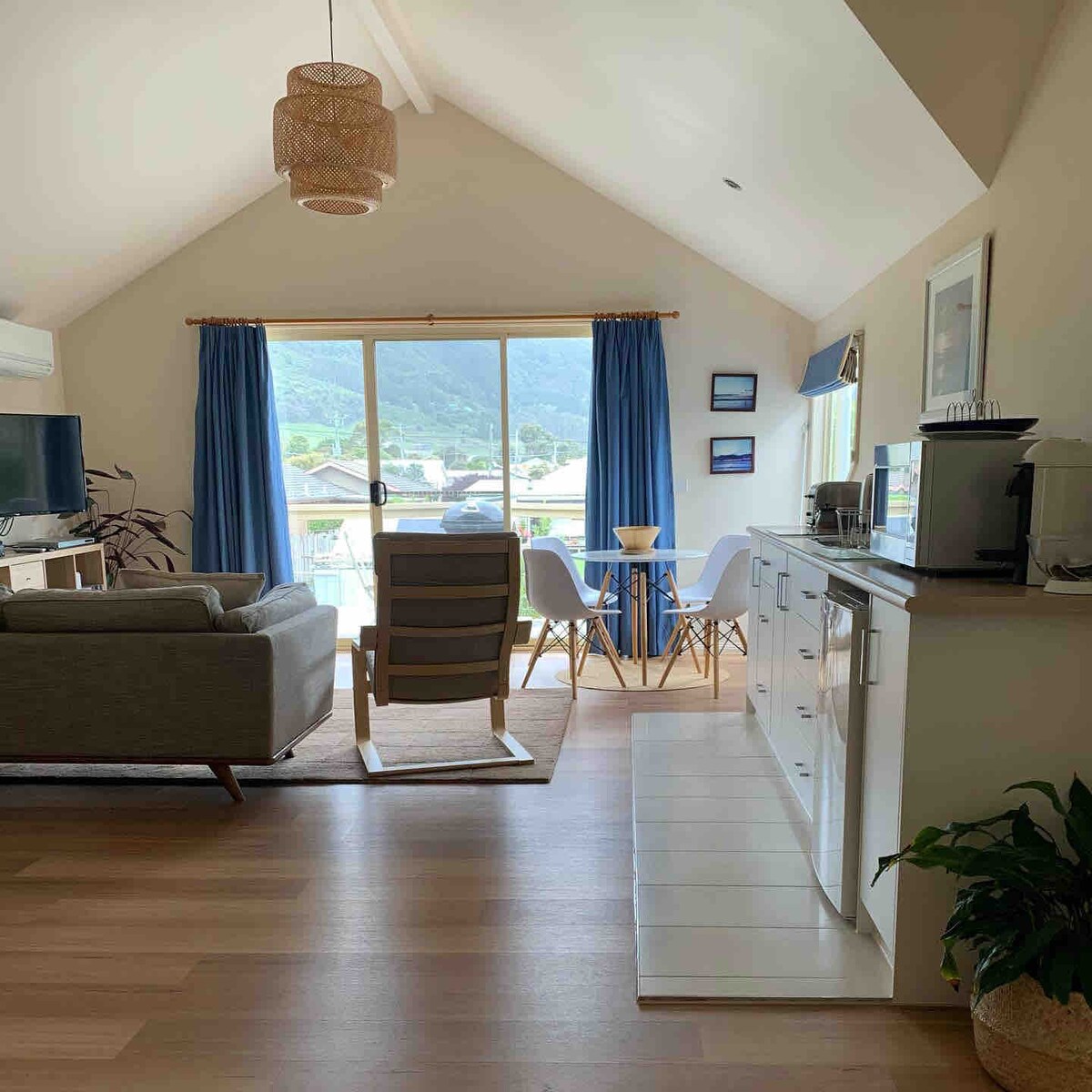 Á móti Kyrrahafinu er frábært útsýni. Slakaðu á á veröndinni og fáðu þér bolla eða vín. Upphituð flísalögð gólf og Deluxe Rainhead Shower með Sukin body vörum. Bay Beach Hut er með hlýlegt og notalegt andrúmsloft og er smekklega skreytt með alvöru friðsæld og friðsælli náttúru fyrir þetta sérstaka frí! Njóttu þess að vera 1 húsaröð að frábærum mat og kaffi! Bókaðu til að slaka á og endurnærast.