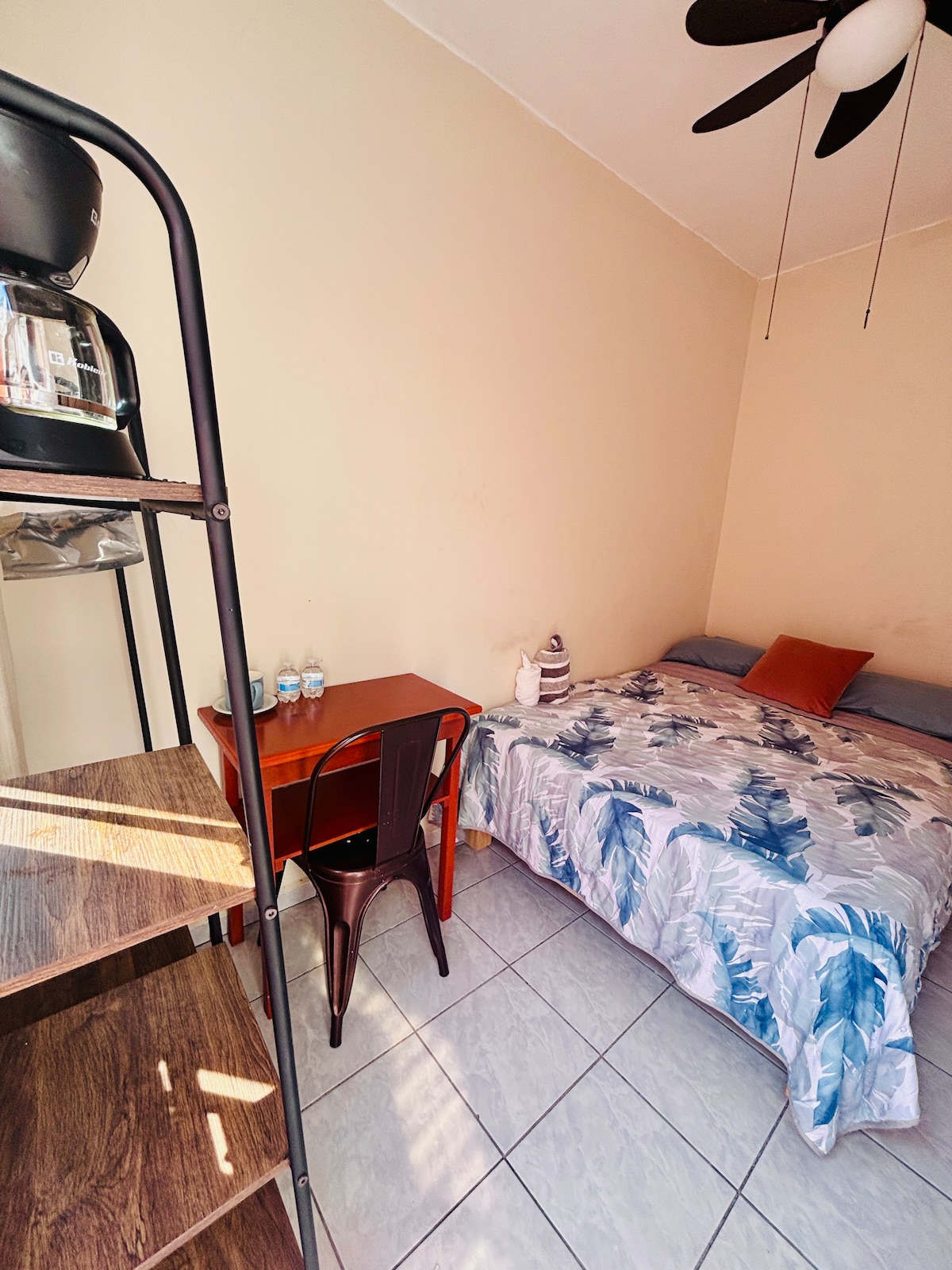Njóttu einfaldleikans í þessari kyrrlátu og miðlægu gistiaðstöðu. Nálægt flugvelli, Yepas, Tienda Guadalajara, Tortilleria, Tortilleria, Water Purifier og matvöruverslunum, staður mjög auðvelt að nálgast, þú getur fundið allt sem þú þarft með heimaþjónustu. Við erum með þvottaþjónustuna innifalda, ekki hlaða þvottinn með þeim þvotti, við þrífum á meðan þú hvílir þig. Loftkæling innifalin. Herbergið er með ísskáp og drasl til notkunar.
