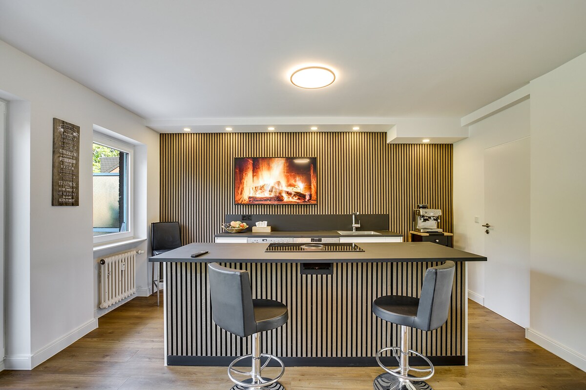 Íbúðin er staðsett beint við Rín í Oberkassel á rólegu og svölu garðhliðinni. Hún er fullbúin fyrir lengri dvöl og innréttuð með hágæða listmunum og húsgögnum. Nýja lúxusbaðherbergið er með regnsturtu og í aðskildu eldhúsi er borðstofa fyrir fjóra. Í samsettri stofu/svefnherbergi er hjónarúm, svefnsófi, barnarúm, stór skápur, skrifborð, snjallsjónvarp og hljómtæki. Bílastæði eru ókeypis, rafhleðslustöð í 50 m fjarlægð.