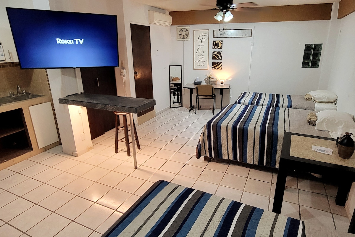 Fjölskylduherbergi með 2 svefnherbergjum, 1 með 2 hjónarúmum og annað með KING-STÆRÐ, er með 2 baðherbergi, borðstofu og eldhúskrók, við erum 100 m frá Soriana, 100 m frá rútustöðinni, 200 m frá íþróttamiðstöð. Herbergið er inni á Hotel Moreno cd Valles og er á 2. hæð, við erum ekki með lyftu