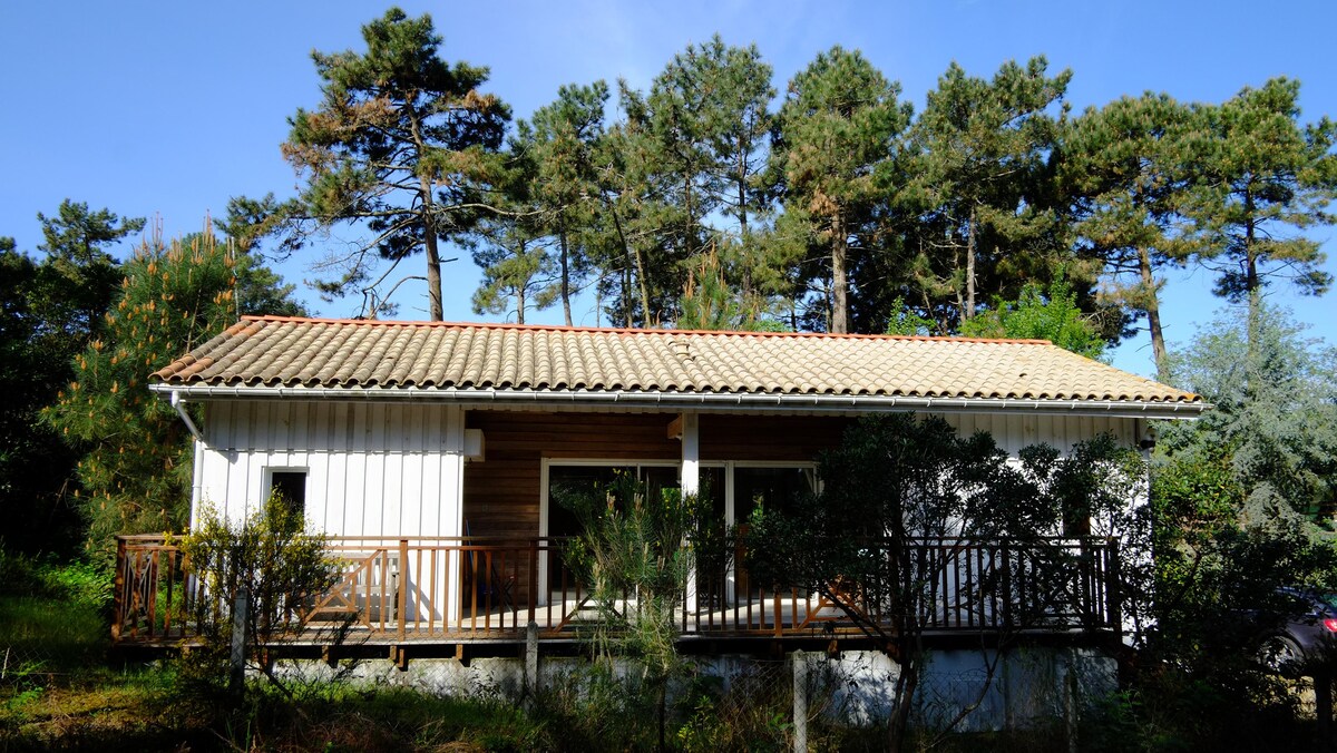 Chalet en bois trois pièces avec une terrasse vue sur la forêt des Landes .Situé à 20 minutes du centre à pied et à 15 minutes de la plage par un sentier ombragé. Au calme, grande terrasse, dont une partie couverte. Petit jardin privatif. Stationnement dans le jardin. Il faut passer par une allée dans le jardin du propriétaire pour accéder au chalet. Les deux chambres ne communiquent que par la terrasse, attention aux enfants en bas age .