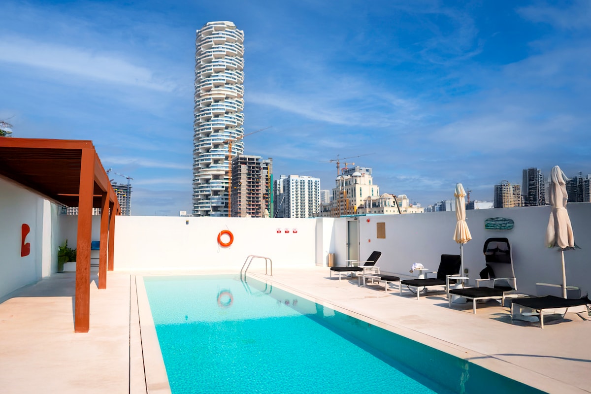 Gistu í glæsilegri íbúð með einu svefnherbergi og útsýni yfir sjóndeildarhringinn í JVC. Fullkomið fyrir pör, ferðalanga sem eru einir á ferð eða viðskiptagistingu. ✓ Einkasvalir með útsýni yfir sjóndeildarhringinn ✓ 1 rúm af king-stærð Aðgangur að ✓ sundlaug og líkamsrækt ✓ Fullbúið eldhús ✓ Háhraða þráðlaust net ✓ Ókeypis bílastæði ✓ Sjálfsinnritun ✓ 7 mín. að FIVE JVC Hotel ✓ Nærri verslun og veitingastöðum Sendu fyrirspurn núna um flutning og afslátt af langtímagistingu!