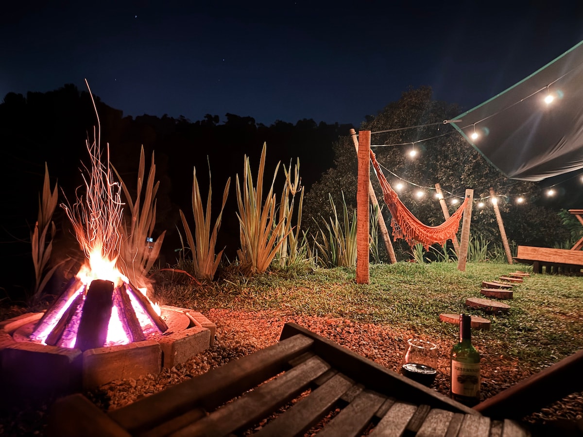 Verið velkomin í Recanto do Céu! Ef þú ert að leita að sveitalegum og þægilegum stað með mikilli náttúru í 5 mínútna fjarlægð frá miðbæ São Roque og vínleiðinni máttu ekki missa af því að gista í eigninni okkar. Við erum með ljósleiðaranet, völl til að spila, leiki, sundlaug, útiarinnog fallegt þilfar með ógleymanlegu útsýni. Mikið af tekjum af dvölinni er fyrir umönnun og mat dýra okkar, þau eru það mikilvægasta hér í króknum og fyrir þeirra hönd kunnum við að meta það!