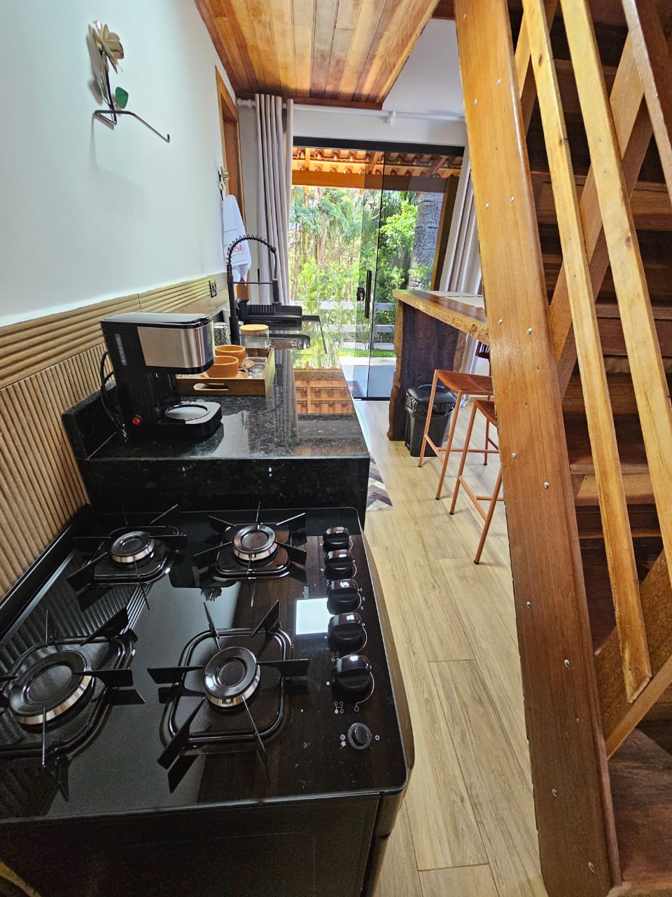 Hún er smíðuð af okkur, fellur vel inn í náttúruna og býður upp á stórkostlegt útsýni. Hún er tilvalin til að fylgjast með tunglupprás og sólsetri, slaka á í baðkerinu, á sófanum eða undir tré. Hún er með hjónarúmi og svefnsófa, snjallsjónvarpi með Netflix og YouTube, minibar, eldavél, sturtu og gasbaðkeri sem hægt er að sökkva sér ofan í, auk þess sem grillið og eldstæðið eru rétt við hliðina á henni. Frá bílastæðinni að kofanum þarf að ganga upp 50 metra og þar er hallandi Santos Dumont-stigi til að komast upp á aðra hæðina.