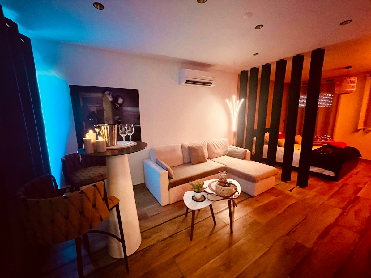 Tvíbýli staðsett á milli lestarstöðvarinnar og miðjunnar með garði og einkasundlaug, lokuðu eldhúsi, tveimur svefnherbergjum, stóru baðherbergi og sturtuklefa með tveimur salernum. Á baðherberginu er balneo-bað fyrir tvo og slökunarsvæði með upphituðum og nuddstól. Þú hefur aðgang að einkagarði með heitum potti utandyra og borðstofu utandyra með einkasundlaug. Bílastæði fyrir nokkra bíla er rétt fyrir framan íbúðina.