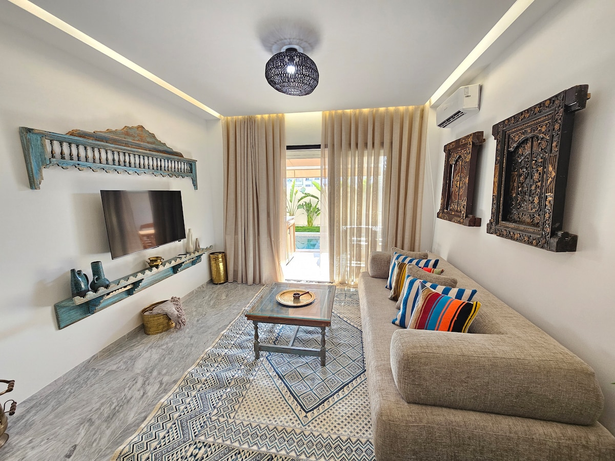 Appartement moderne avec salon lumineux et chambre confortable, décoré avec goût et entièrement équipé pour votre confort. Profitez d’une piscine élégante et privative dans un jardin agréable pour des moments de détente inoubliables. Situé à Ain Zaghouan Nord dans une zone résidentielle de haute qualité , à proximité des Berges du Lac et de La Marsa et à 10mn de 🛫 Il offre un emplacement idéal entre calme, loisirs et attractivité. L’endroit parfait pour allier repos, style et convivialité