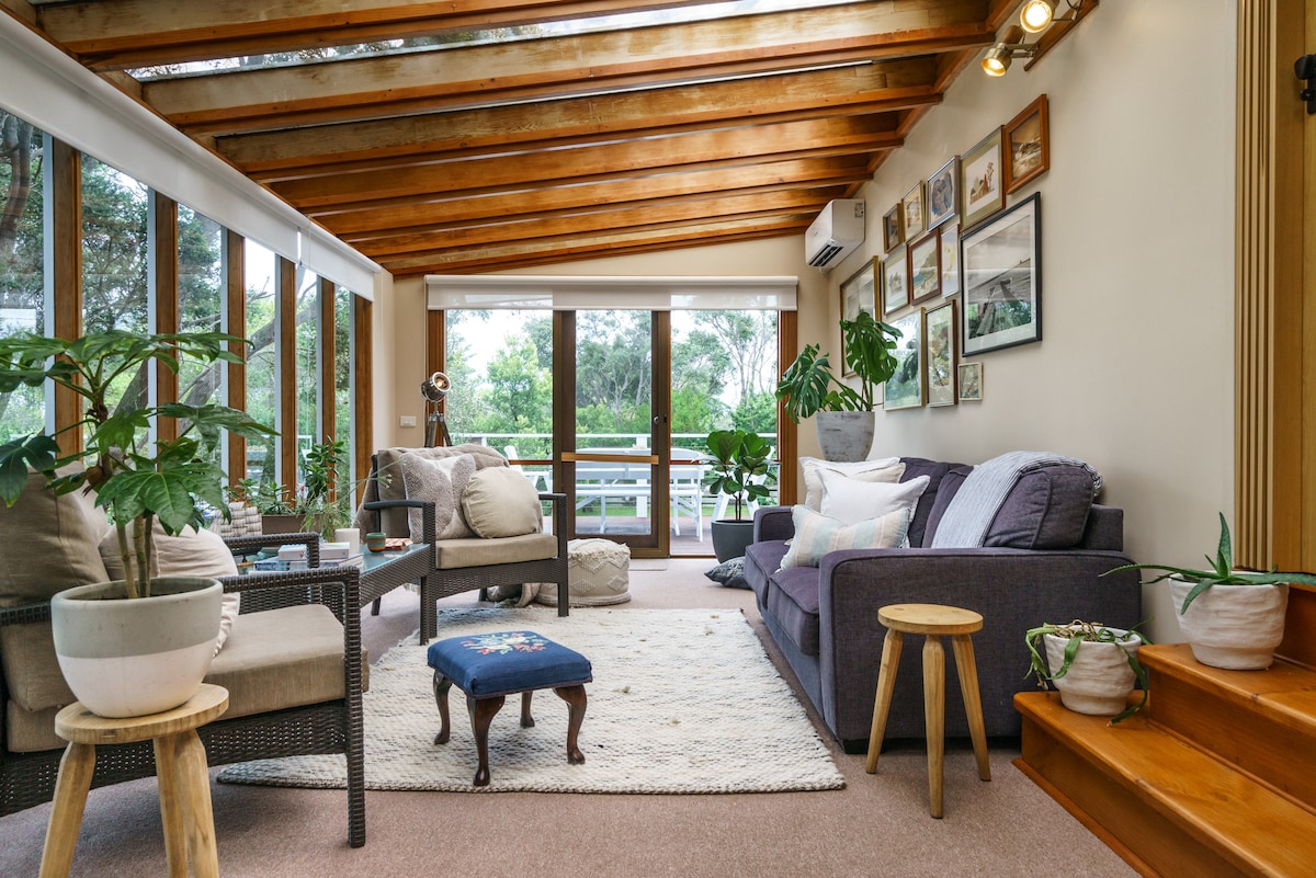 Upprunalegur strandskáli Barwon Heads frá sjöunda áratugnum, glæsilega endurnýjaður, staðsettur á rólegum stað en í göngufæri frá öllu. Þægilega rúmar 6 manns og gæludýravænt. Í eigninni eru þrjú ríkuleg, ljós fyllt svefnherbergi (2 king 1 queen), tvö baðherbergi ásamt aukasalerni og heitri og kaldri útisturtu, fullbúnu eldhúsi og þvottahúsi. Nýr útiskáli fyrir byggingarlist býður upp á auka útistofu og borðpláss.