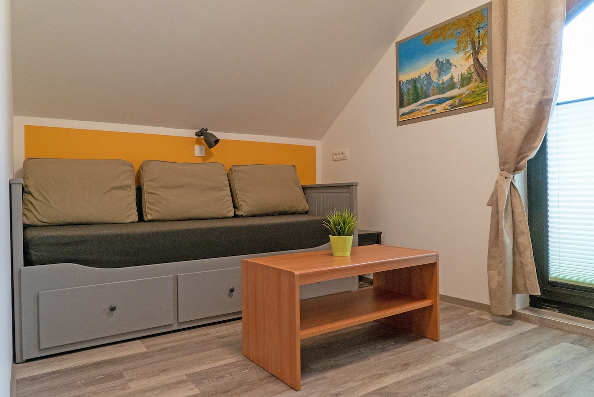 Mojstrana er fallegt slóvene alpaþorp sem er hliðið að Triglav-þjóðgarðinum í Julian Ölpunum. Landslagið er tilkomumikið og tilvalið fyrir fjölbreytta afþreyingu eins og skíði, klifur, gönguferðir og hjólreiðar. Þessi stúdíóíbúð er 37 m2 að stærð og aðgengileg í gegnum innri stiga frá fram- og bakhlið eignarinnar. Þar er að finna lítið eldhús og sérbaðherbergi með sturtu.
