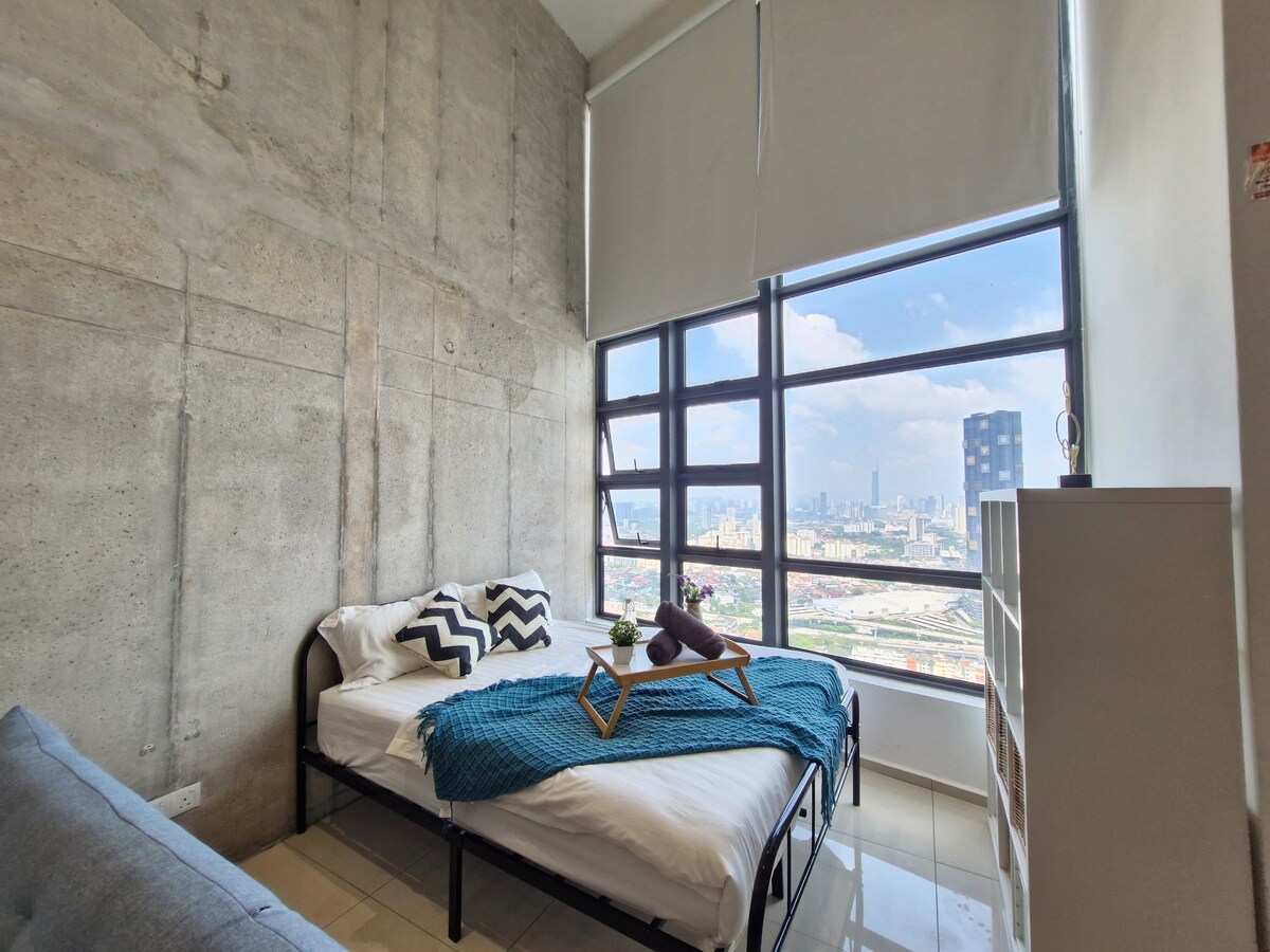 Grand Loft okkar er fullt af alls konar þægindum og aðstöðu sem þú þarft á að halda! Við erum búin hágæðahúsgögnum, afþreyingareiningu (karókí) og frábærum frágangi sem gefur ekki aðeins meira virði heldur einnig upplifun þína af því að gista hér. Við erum í aðeins 15 mínútna fjarlægð frá miðborginni, 5 stoppistöðvum frá Bukit Bintang (Pavillion) og 6 stoppistöðvum frá KLCC með lest. Við erum vel staðsett með 4 mínútna göngufjarlægð í gegnum verslunarmiðstöðina að MRT-stöðinni við lv 1