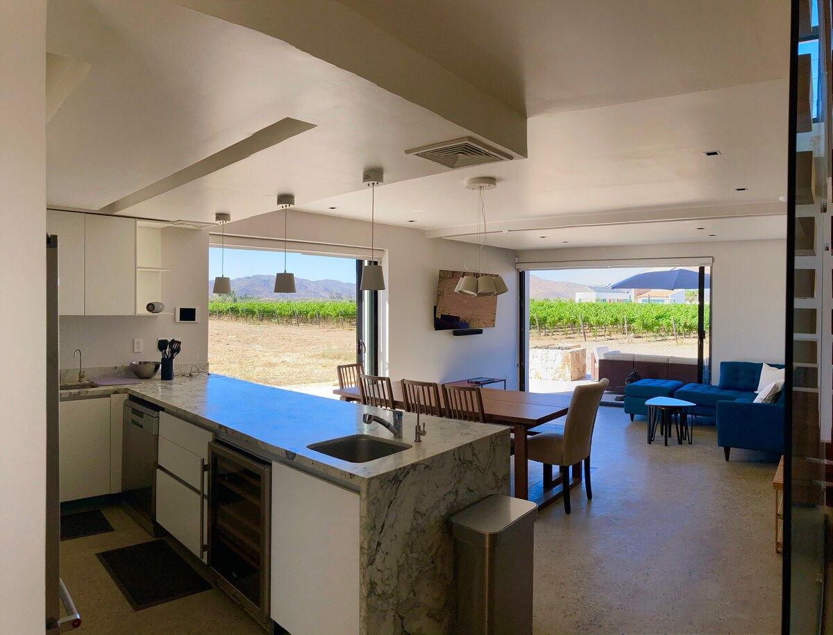 Vaknaðu fyrir framan vínekruna í afslappandi, friðsælu og náttúrulegu umhverfi. Nútímalegt og notalegt 2 hæða hús. Frábær staðsetning í hjarta Valle de Guadalupe með útsýni yfir vínekrur frá hvaða rými hússins sem er, innan afgirt íbúðarsvæði Docepiedras. Hleðslutæki fyrir rafbíla er í boði. Vaknaðu fyrir framan vínekruna í afslöppuðu, rólegu og náttúrulegu andrúmslofti. Búseta á 2 hæðum með fallegu útsýni yfir vínekruna frá öllum rýmum. Tilvalin staðsetning í hjarta Valle de Gpe innan Docepiedras.