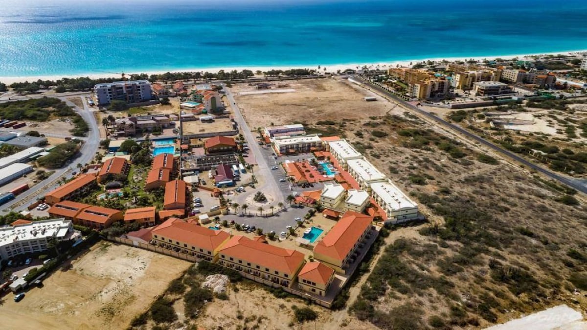 Glænýr dvalarstaður!! Velkomin á þennan einstaka fína Oasis, hinum megin við götuna frá friðsælum grænbláum vötnum Arúba. Þessi vin hefur öll þau þægindi sem þú gætir viljað fyrir upplifun þína af Arúba. Hannað með fyllstu persónuleika, bekknum og fegurð. Stórkostleg sundlaug og setustofa, eldgryfja utandyra, þaksvæði til að njóta sólsetursins. Eignin þín er með vel búin eldhús, stofuna og svefnherbergið sem eru frábær og úthugsuð til þæginda og þæginda.