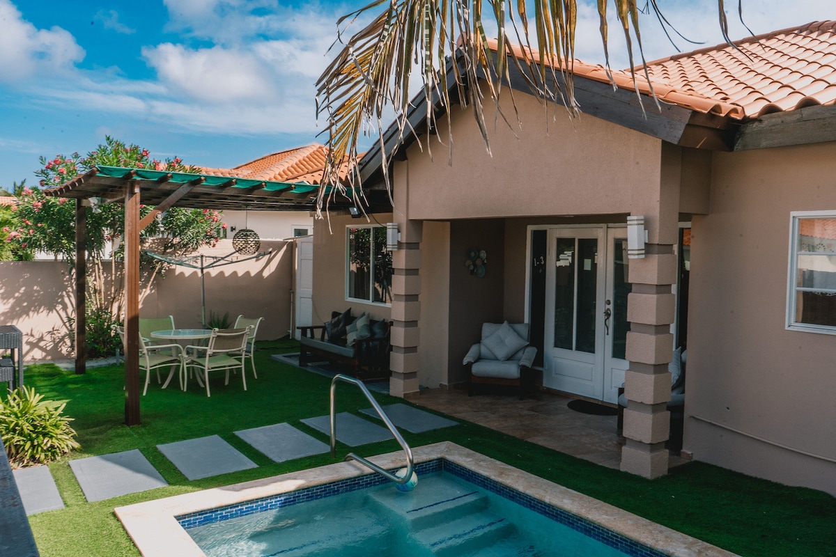 Upplifðu Arúba á þessu notalega heimili með mjög stórri einkasundlaug í hitabeltisgarði. Rúmgóða sundlaugarsvæðið er með verönd með þægilegum hægindastólum, útiverönd með grilli. Njóttu dagsins við sundlaugina eða farðu í stutta 15 mínútna gönguferð á næstu strönd. Að innan bíður nútímalegt eldhús með öllum nauðsynjum. Allt húsið er með loftkælingu og svefnherbergin eru bæði nútímaleg og rúmgóð. Skapaðu varanlegar minningar með vinum og fjölskyldu á þessu fullkomna orlofsheimili.