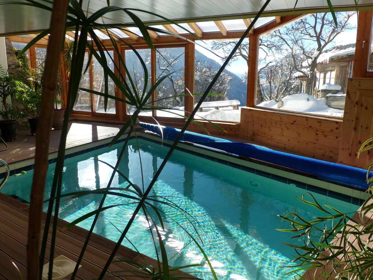 CHALET at the top of the slopes - surrounded by nature. 1800m height. no noise. not overlooked. spacious, very comfortable, neat decoration. tourist classification *** 6 chbres. exceptional location facing south # wood terrace # sun terrace 300 days/year # nature # ideal for families, friends, sportspeople! wood-fired Nordic bath on the terrace. summer and winter- possible to rent for short stay (3 nights minimum). not access in winter by car - or 4* 4. farangursgeymsla möguleg.