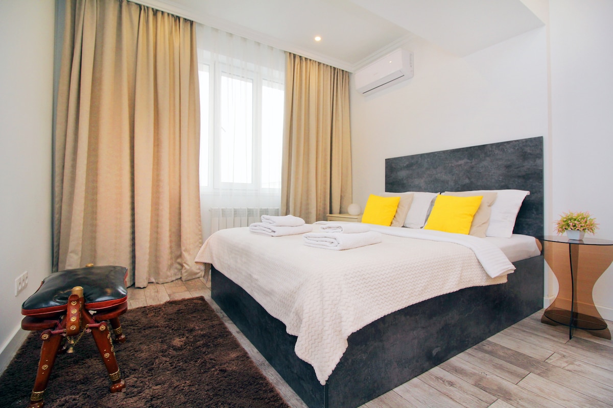 Besta staðsetningin til að upplifa stemninguna í Almaty. Miðstöðin þar sem allt er í göngufæri! Nálægt verslunarmiðstöðinni, kaffihúsum, kvikmyndahúsum, 28 Panfilov 's park, Gorky Park, Zoo, Green Bazar, sinfóníu, óperu o.s.frv. Þægindin: uppþvottavél, þvottavél, kaffivél, loftkæling, sjónvarp, 2 netveitur Kazaktelecom 500mb & AlmaTV 100mb, straujárn og SMART-LOCK. Handklæði og sturtuklefi eru til staðar fyrir alla gesti.