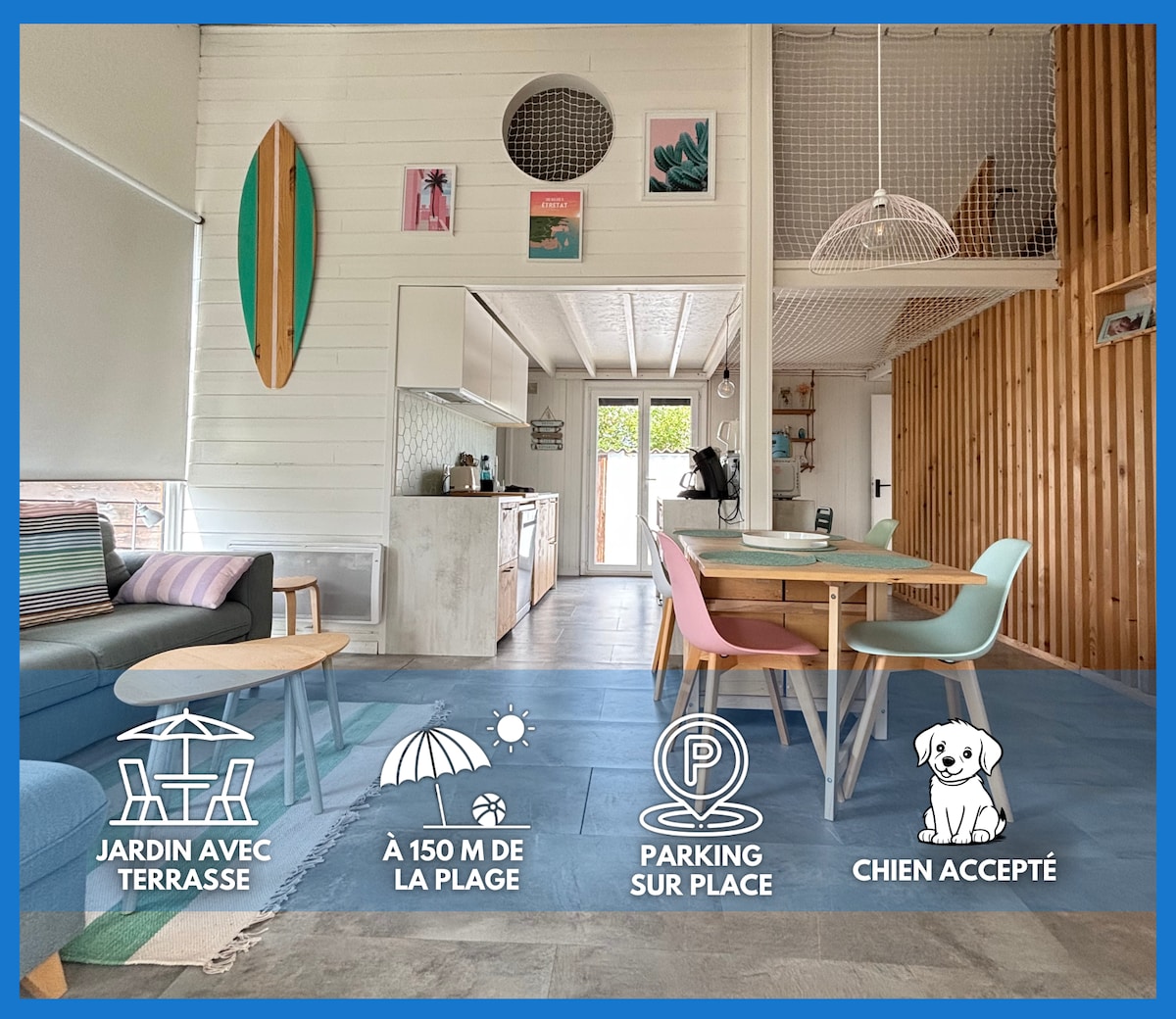 Asnelles est une charmante station balnéaire familiale nichée au cœur des plages du débarquement, à 10 mn d Arromanches, et Bayeux. Notre maison en bois est située à 150 m de la plage et à 10 mn à pied des commerces et restaurants. Notre logement est confortable, bien équipé et décoré sur le thème de la mer. Il dispose de deux terrasses aménagées et d'un grand jardin clos. Parking privatif Lits faits à votre arrivée, linge de toilette et de maison fourni. Chiens sont les bienvenu