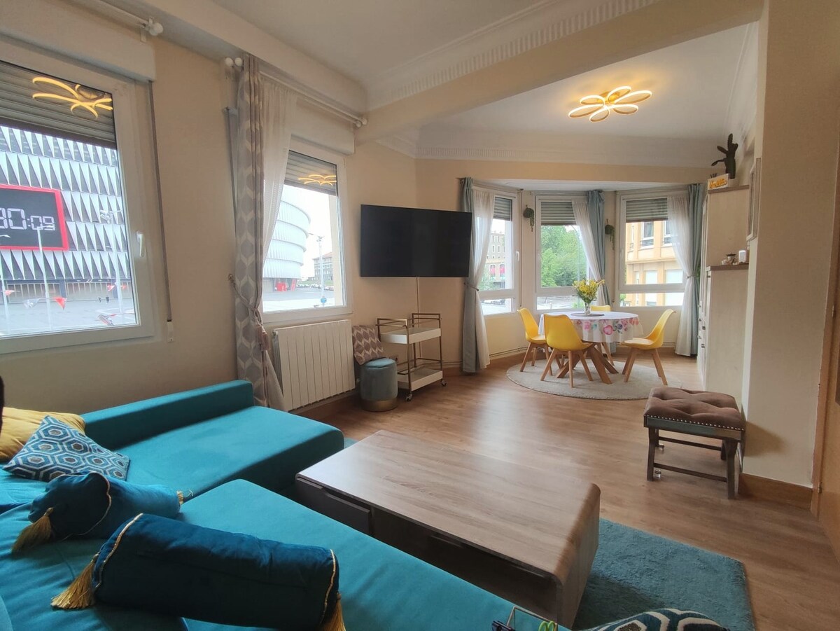 Bienvenidos a este piso acogedor, alegre, y con mucha luz; Un apartamento completamente exterior, en una primera planta, con vistas al mítico estadio de San Mamés. El alojamiento se encuentra a escasos pasos del tranvía , del metro y de la estación de autobuses Intermodal. El parque Doña Casilda , el Palacio Euskalduna se alcanzan en 5 minutos a pie. Y puede llegar hasta el museo Guggenheim en 15 minutos caminando al lado de la ría.