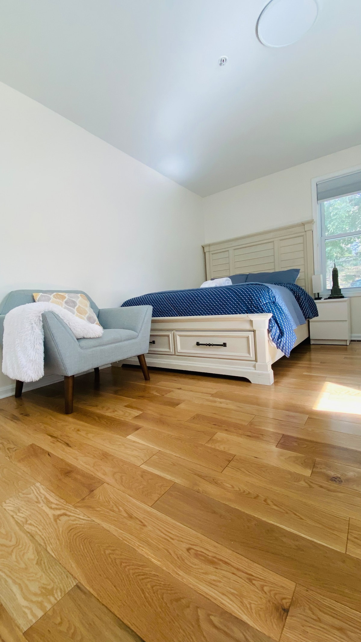 Stór, sólrík íbúð með einu svefnherbergi, sérinngangi, fallega skreyttum, gasarni og 50" flatskjá og þráðlausu neti. Stórt svefnherbergi með king-rúmi, fataherbergi. Fullbúið eldhús með öllum þægindum. Gestir geta gengið(30 mín) eða tekið strætó (2 mín ganga að strætóstoppistöð) að NIH, Walter Reed og/eða neðanjarðarlest. Ferskt kaffi og te í boði fyrir alla dvölina. Morgunverðarvörur fyrir fyrsta morguninn : morgunkorn, ferskar beyglur og rjómaostur, lítil ílát með mjólk og OJ. Ein húsaröð frá Rock Creek Park.