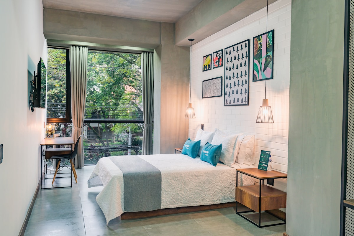 Verið velkomin í 818 District, hönnunarloftíbúðina okkar sem býður upp á blöndu af sjarma og nútímaþægindum. Þessi risíbúð er hönnuð með öllu sem þú þarft fyrir notalega dvöl með háhraða þráðlausu neti, loftkælingu og sérbaðherbergi. Fullkomið til að slappa af. Vertu með þægilegt hjónarúm, flatskjásjónvarp og upphengda hillu fyrir nauðsynjar. Þú ert steinsnar frá líflegu næturlífi, veitingastöðum og menningu í hjarta Laureles. Tilvalið fyrir ferðalanga sem eru einir á ferð, pör eða viðskiptaferðir í leit að einhverju einstöku.