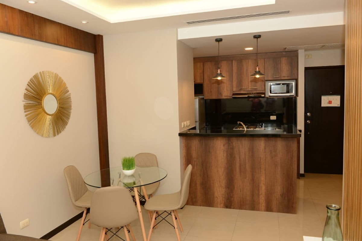 Fullbúin húsgögnum og uppgerð föruneyti tilvalið fyrir útlendinga og stjórnendur. Lúxus frágangur. Queen size rúm, svefnsófi, snjallsjónvarp í stofunni og herberginu, þráðlaust net. Það er staðsett á einu virtasta svæðinu og í 3 mínútna fjarlægð frá flugvellinum. Sólarhringsmóttaka er í boði. Nálægt kvikmyndahúsum, bönkum, veitingastöðum, hótelum, matvöruverslunum, sjúkrahúsi og verslunarmiðstöðvum. Það er með þvottavél og þurrkara, rafmagnseldavél, ísskáp, ísskáp, örbylgjuofn, örbylgjuofn, kaffivél, kaffivél, brauðrist, eldhúsáhöld.