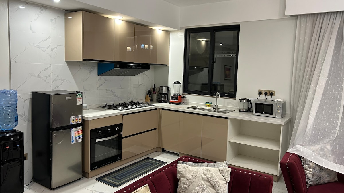 Kynnstu lúxus í borginni! Verið velkomin í glæsilegu tveggja rúma íbúðina okkar í Kilimani, Naíróbí. Útsýnið yfir borgina er heillandi á 14. hæð í nýrri byggingu (fullfrágengin árið 2023). Gakktu að verslunum, veitingastöðum og njóttu líflegrar menningar Naíróbí. Fullkomið fyrir vinnu eða ferðamenn. Bókaðu núna og bættu upplifun þína í Naíróbí!