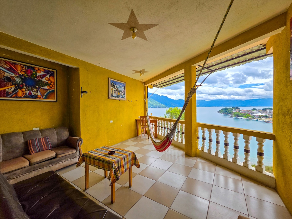 This brand new modern home is lakefront to Lake Atitlan Guatemala, the most beautiful lake in the world. Powered only by the sun, this green energy home has 3 bedrooms and 3.5 baths with a large hot tub, futbol (soccer) field, and modern dock. Come to relax and get away, and/or get some work done with highspeed Starlink internet with a powerful mesh wifi network. Residential area, yet only 5 min walk to restaurants/bars. The solar only heated hottub is not hot on rainy or cloudy days.
