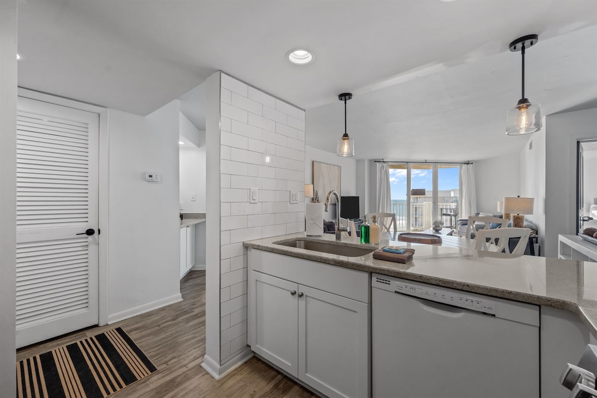 Atlantic Beach Retreat við sjávarsíðuna var að ljúka endurbótum og er tilvalin fyrir par eða fjölskyldu þína. Á sumrin bjóðum við upp á vikuleigu frá sunnudegi til sunnudags til sunnudags. Á háannatíma leigjum við þessa íbúð út í að minnsta kosti tvær nætur. Eignin innifelur stóran, opinn völl, leikvöll, inni-/útisundlaug, tennisvelli, körfuboltamark, gas- og kolagrill, gufubað, heitan pott, líkamsræktarstöð, lyftur um alla bygginguna og aðgengi fyrir hjólastóla að ströndinni.
