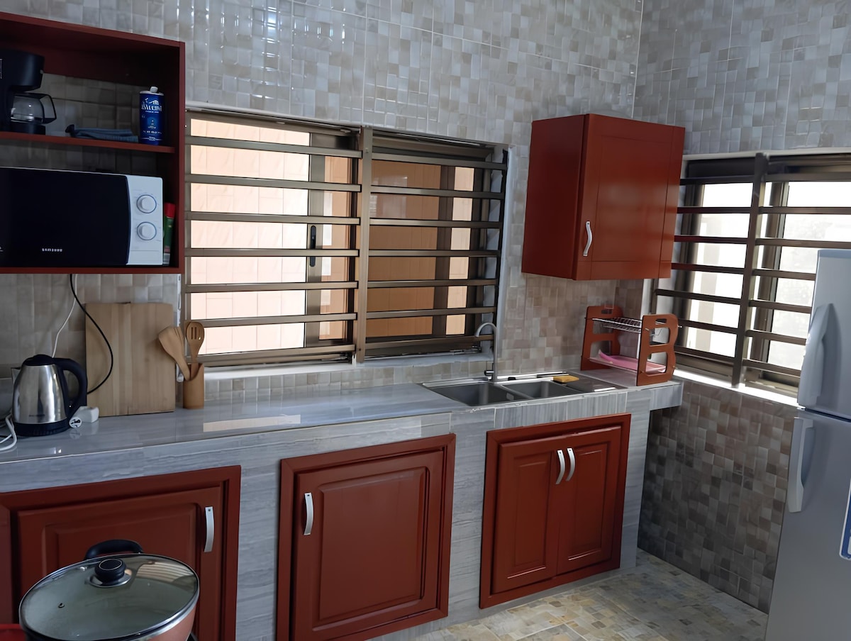 Íbúðin er staðsett í miðbæ Ouidah, 2 mínútum frá Temple of the Pythons, Basilica of Ouidah, Zinsou Foundation og 10 mínútum frá ströndinni. Hverfið er rólegt og nálægt veitinga- og verslunarstöðum. Þetta er fullkominn staður til að skoða borgina Ouidah, upplifa vodoun-menninguna og upplifa vodoun-dagana. Gistiaðstaðan er með rúmgóðu svefnherbergi með loftkælingu og loftræstingu, stofu, hjónarúmi, þráðlausu neti, fullbúnu eldhúsi, vinnuaðstöðu og bílastæði.