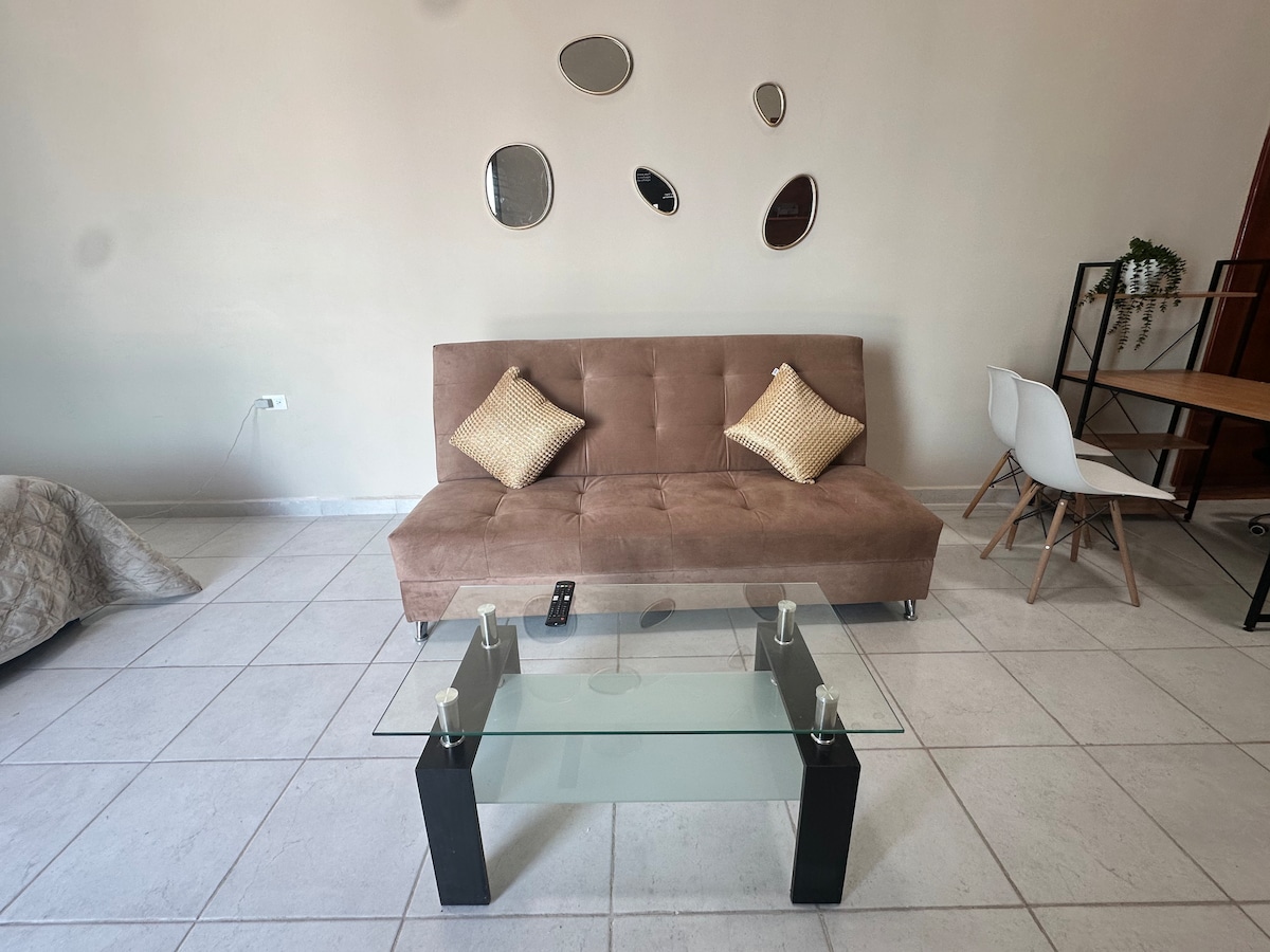 Einstakt og tilvalið rými fyrir þig fullkomlega sjálfstætt með hjónarúmi, fullbúnu baðherbergi, ísskáp og eldhúskrók. Hann er tilvalinn fyrir einn eða tvo, mjög bjart rými og með þráðlausu neti sem hentar vel til að vinna heiman frá sér. Njóttu sjónvarpsins með kapalrásum, ljósi og heitu vatni allan daginn og með góðu útsýni á efri hæðinni. Frábær staðsetning, með samgönguþjónustu, ein gata frá neðanjarðarlestinni. Það er staðsett 20 mín frá Capu FLUGSTÖÐINNI, Oxxo í 5 mín göngufjarlægð, apótek og Market 3 blokkir í burtu