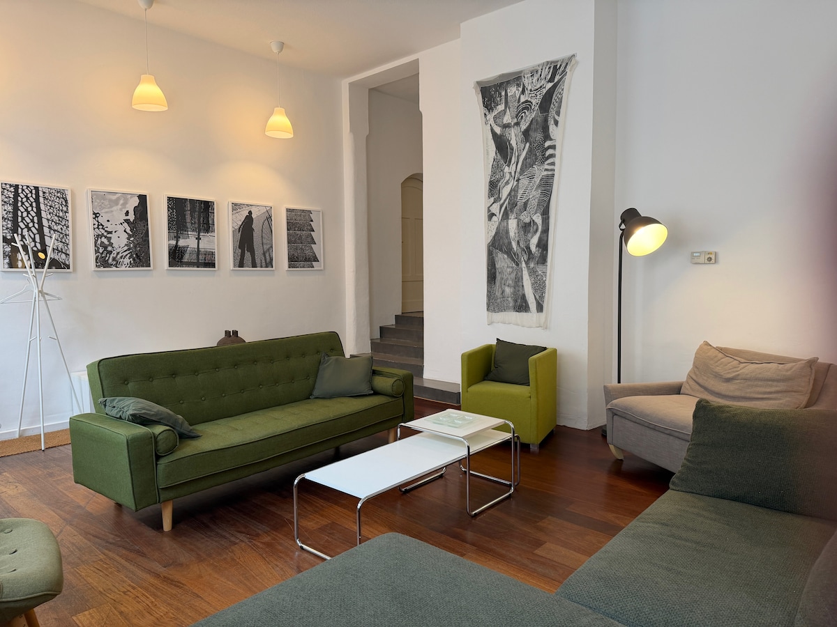 Welcome to the heart of Munich Schwabing! A special place of 138 square meters, which enchants with a mixture of modern and vintage. A stylish temporary home with its own entrance and also an inspiring workplace with ideal connections to the trade fair, city center, museums and the Olympic Park. The location is perfectly situated in Munich. I will be happy to issue an official invoice. Oktoberfest: min 8 Person